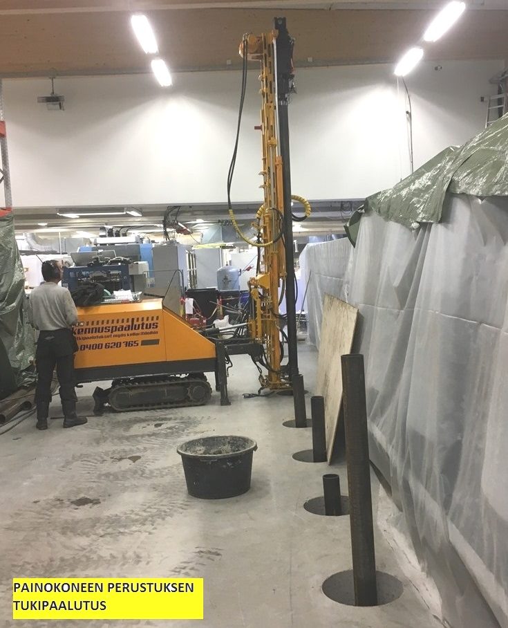 Työkoneiden tukipaalutukset eero2016 Julkaistu 26.2.2017 Julkaistu kategoriassa Yleinen Työkoneen perustukset ovat, joskut osoittautuneet liian heikkorakenteisiksi Teräsputkipaaluilla saadaan korjaus aikaan nopealla aikataululla, pienin muutoksin ja kustannuksin. Teräspaalut valmiina , ennen katkaisuaan. Syvyys lattiapinnasta 8,5 metriä Painokoneen tuenta itse paalutus suoritettu yhden työpäivän aikana.